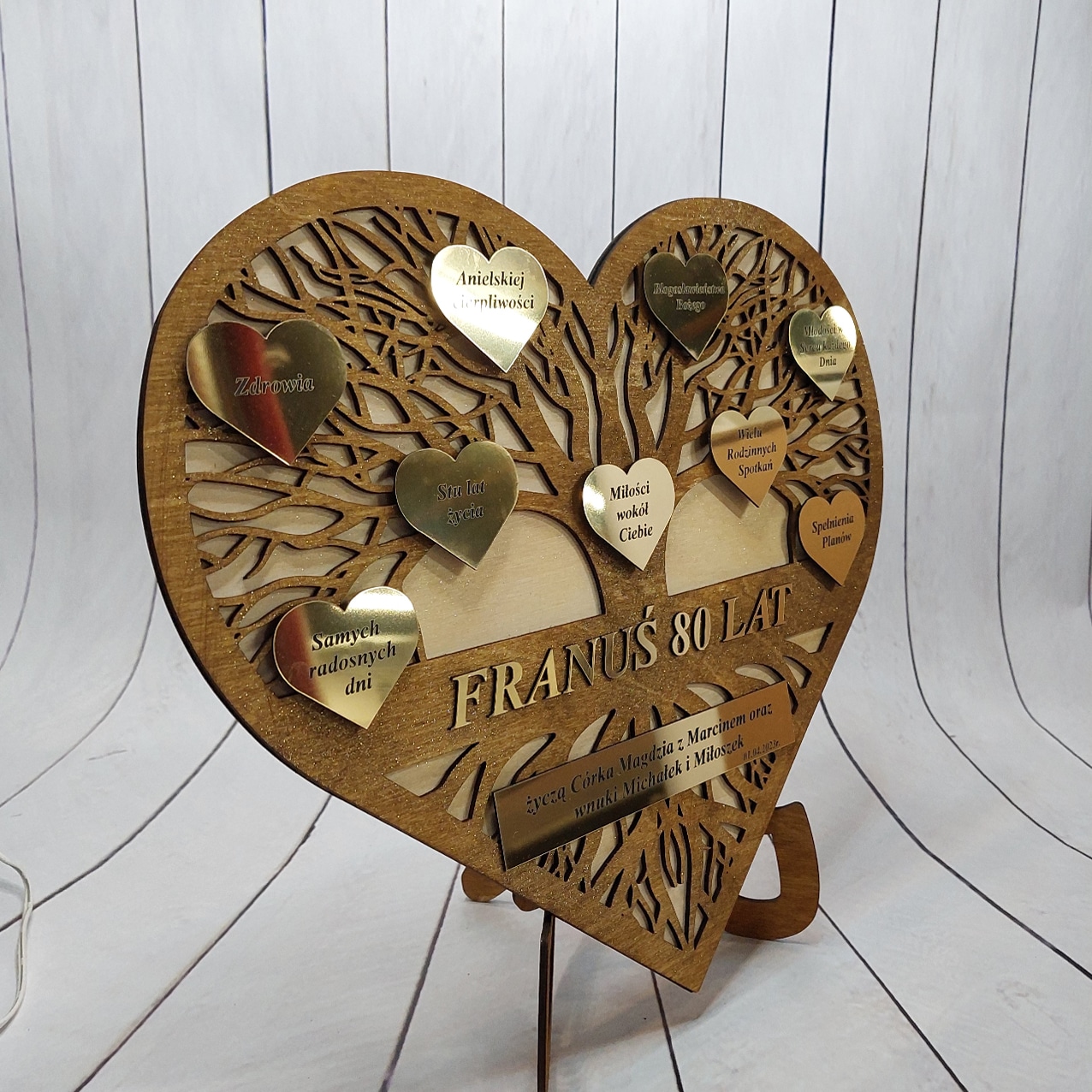 ✓ Personalizowane napisy – imię jubilata, liczba lat, dedykacja od rodziny lub bliskich ✓ Eleganckie wykończenie – połączenie jasnego drewna i lustrzanego akrylu ✓ Symbolika drzewa i serc – życzenia zdrowia, miłości, szczęścia i radości ✓ Ręczna produkcja – każdy egzemplarz powstaje z najwyższą dbałością o detale ✓ Stabilna forma – drzewko posiada podstawę, dzięki której można je postawić w dowolnym miejscu ✓ Idealna alternatywa dla kartki z życzeniami – zostaje na lata jako sentymentalna pamiątka ✓ Możliwość użycia jako dekoracji urodzinowej lub elementu prezentacji ✓ Unikalny projekt – wyróżnia się wśród standardowych prezentów