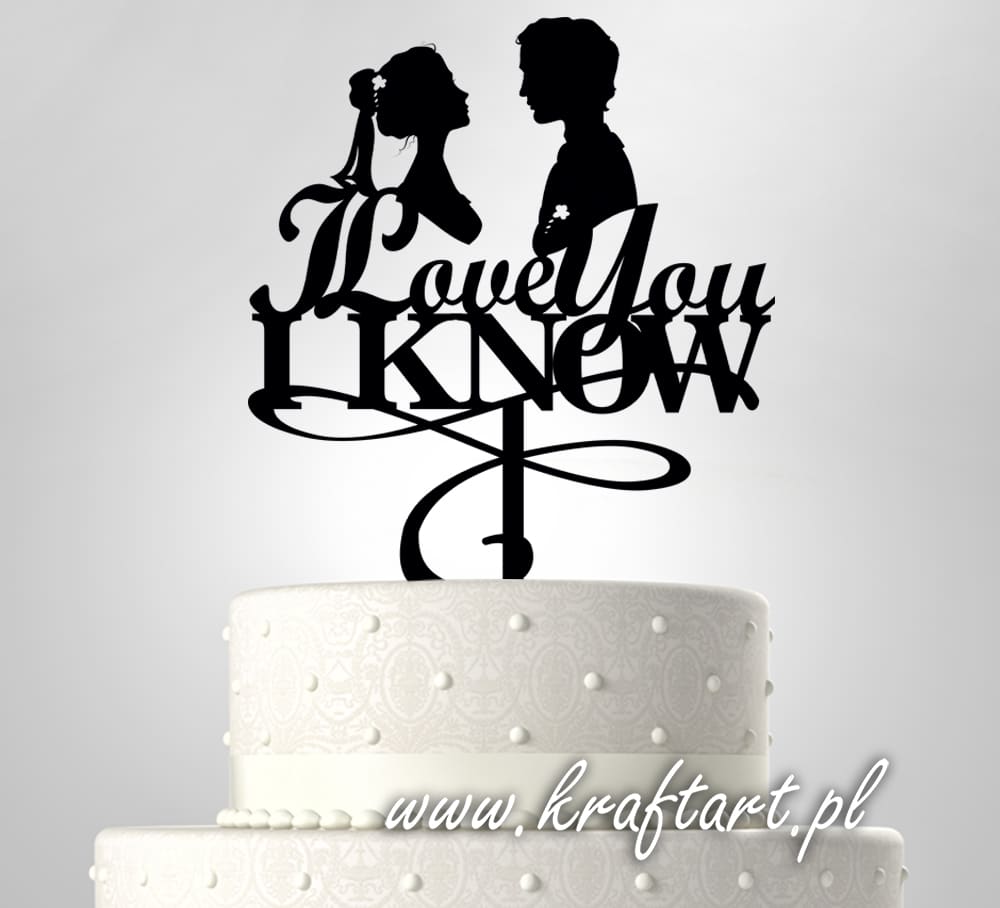 Hasło „I Love You – I Know” symbolizuje bliskość, pewność oraz wyjątkową więź między dwojgiem ludzi. Jednocześnie motyw sylwetek pary nadaje całości intymny, filmowy charakter. Dzięki temu topper idealnie pasuje zarówno do wesel romantycznych, jak i do uroczystości w stylu nowoczesnym czy popkulturowym.
