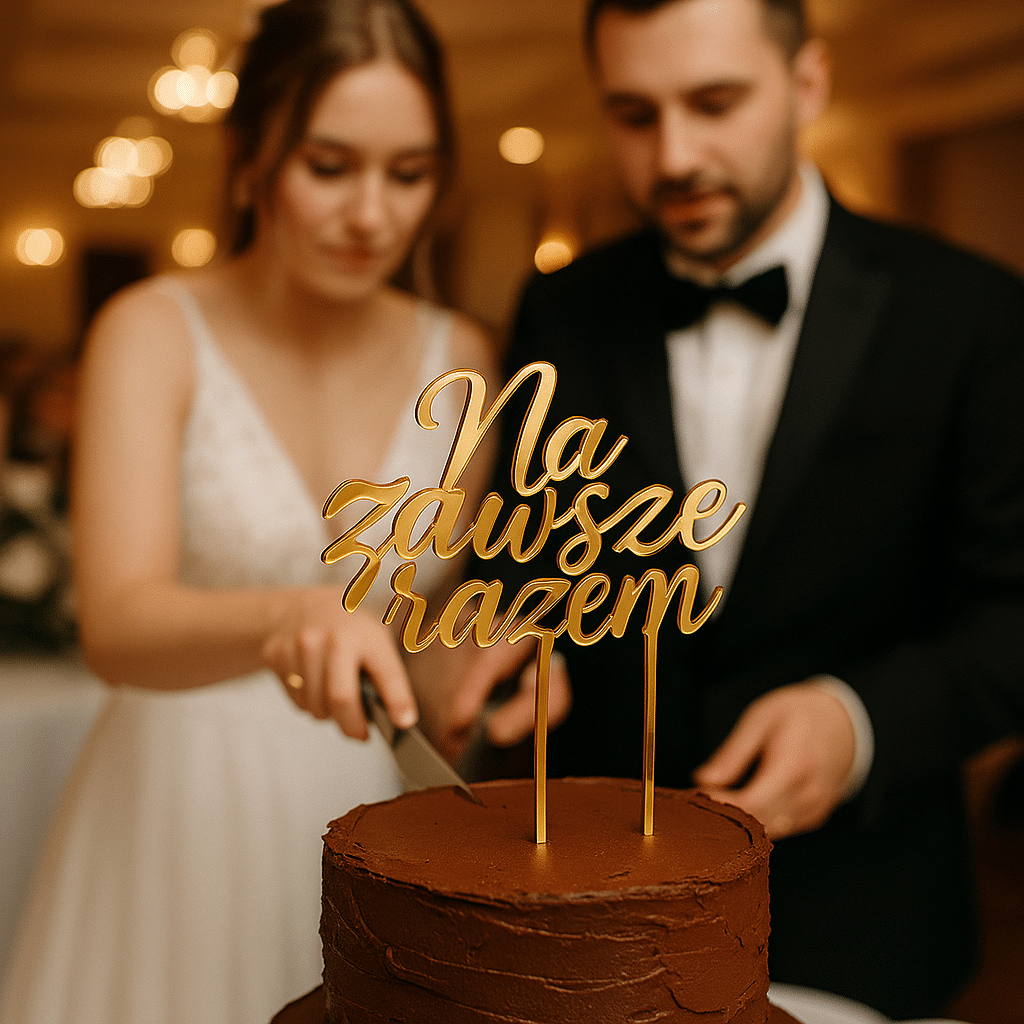 Ciepłe i naturalne, wykonane zazwyczaj ze sklejki lub drewna litego. Świetnie wpisują się w styl rustykalny, boho, vintage, a także wesela plenerowe. Można je łatwo personalizować imionami, datą, inicjałami lub mottem. Wskazówka: Zwróć uwagę na kolor drewna – jasne wykończenia lepiej prezentują się na ciemnych tortach, natomiast ciemniejsze drewno pięknie kontrastuje z jasnymi kremami i bielą.